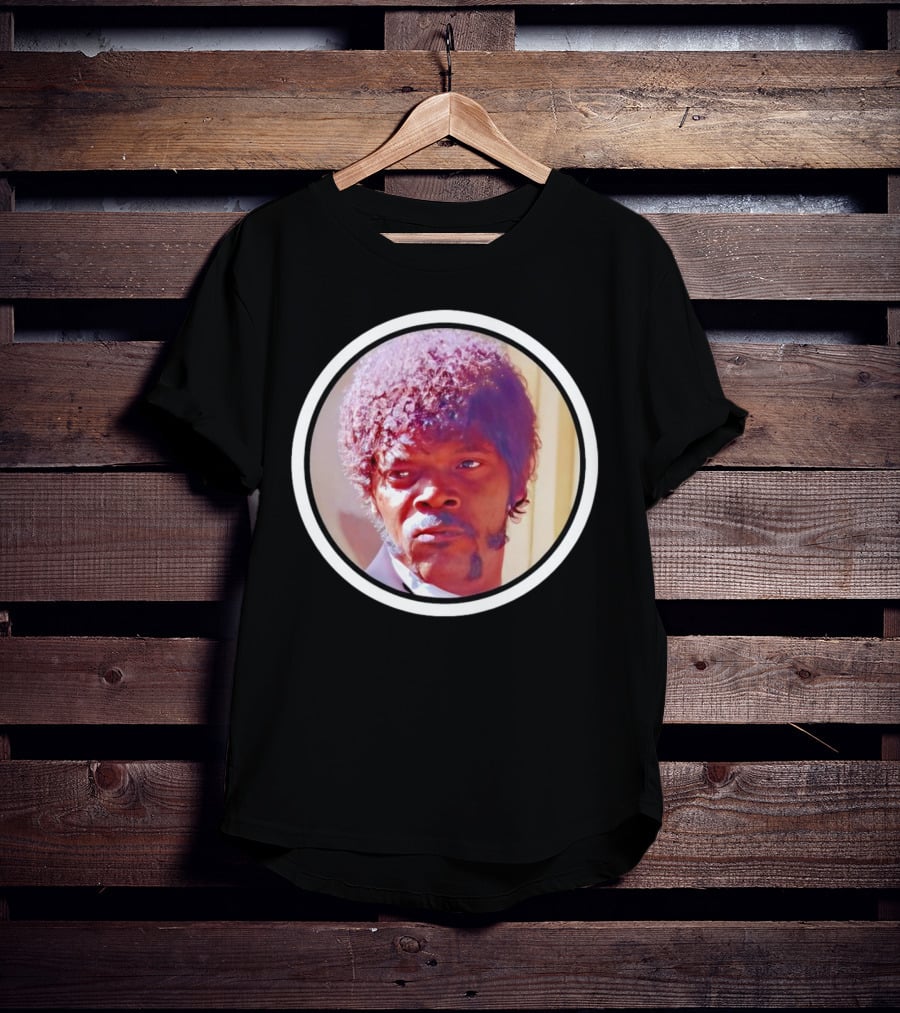 Jules Winnfield Iconic Look Pulp Fiction Samuel L Jackson Photo Shirt made from 100% pre-shrunk ring-spun cotton, unisex regular fit based on U.S. standard sizing. The shirt is designed, cut, sewn, and printed in the United States. Available in sizes S-5XL.
