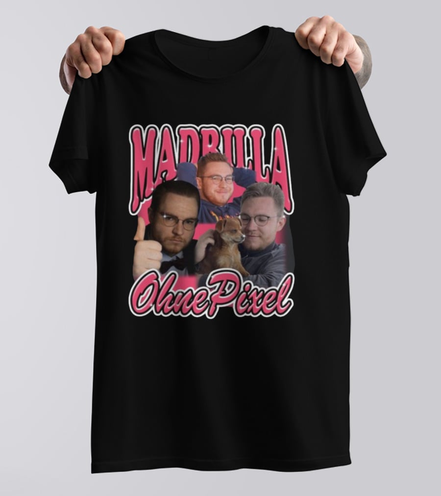 Madrilla OhnePixel Thumbs Up Dog Trio Shirt made from 100% pre-shrunk ring-spun cotton, unisex regular fit based on U.S. standard sizing. The shirt is designed, cut, sewn, and printed in the United States. Available in sizes S-5XL.
