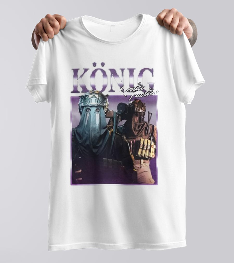 König Kortac Faction Masked Figures with Tactical Gear Shirt made from 100% pre-shrunk ring-spun cotton, unisex regular fit based on U.S. standard sizing. The shirt is designed, cut, sewn, and printed in the United States. Available in sizes S-5XL.