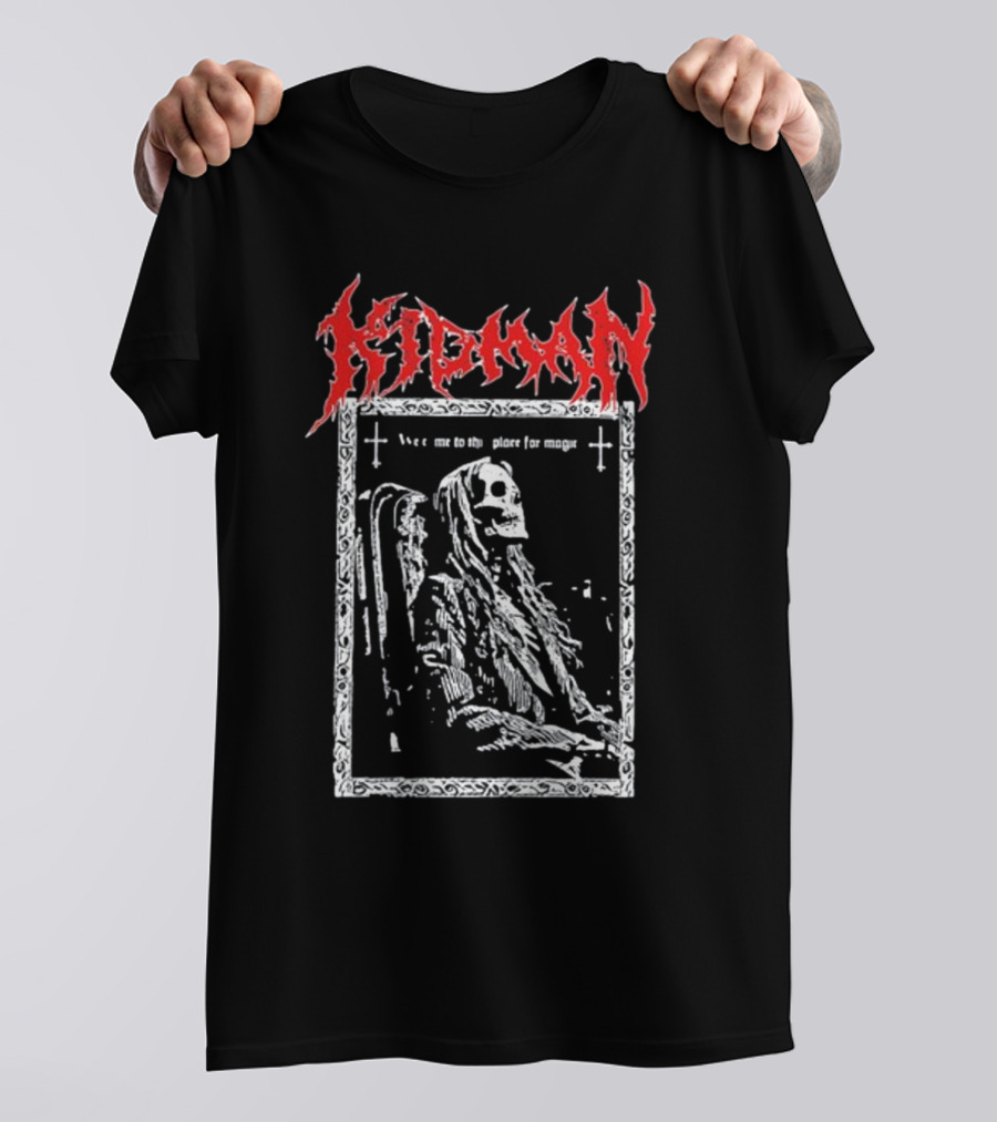 Kidman We Come To This Place For Magic Death Metal Skeleton Chair Shirt made from 100% pre-shrunk ring-spun cotton, unisex regular fit based on U.S. standard sizing. The shirt is designed, cut, sewn, and printed in the United States. Available in sizes S-5XL.