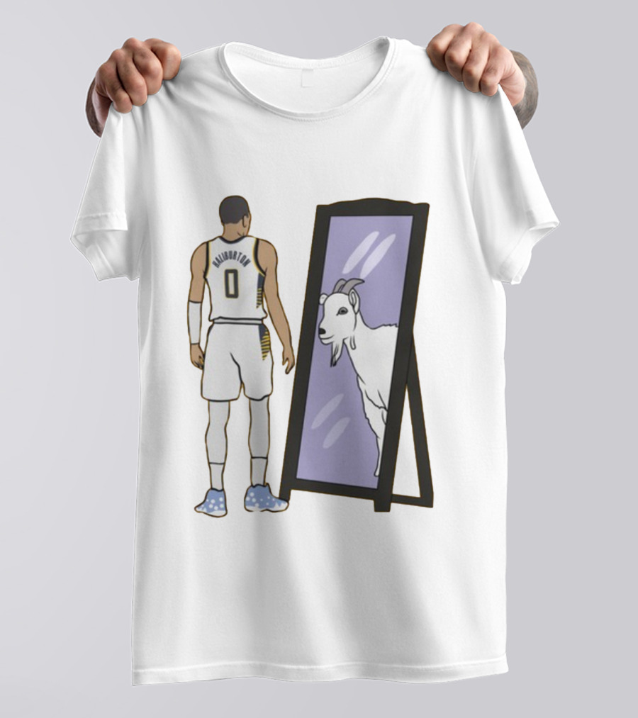 Tyrese Haliburton 0 Reflecting Goat in Mirror Shirt made from 100% pre-shrunk ring-spun cotton, unisex regular fit based on U.S. standard sizing. The shirt is designed, cut, sewn, and printed in the United States. Available in sizes S-5XL.