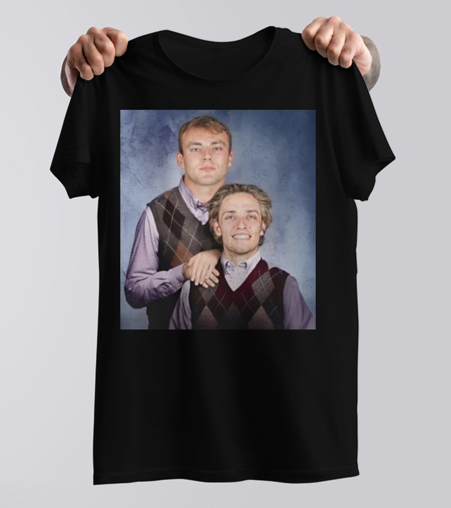 Carson Beck Brock Bowers Step Brothers Comedy Portrait Shirt made from 100% pre-shrunk ring-spun cotton, unisex regular fit based on U.S. standard sizing. The shirt is designed, cut, sewn, and printed in the United States. Available in sizes S-5XL.