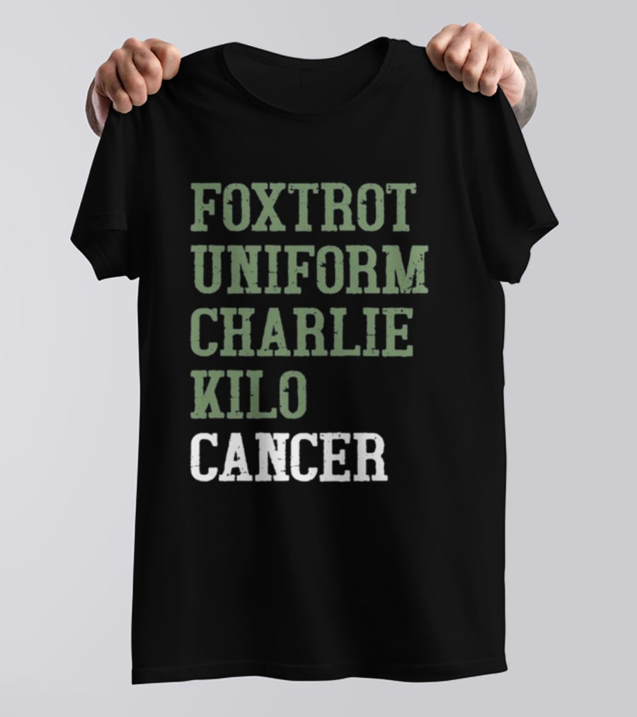 Dave Mustaine Foxtrot Uniform Charlie Kilo Cancer Shirt made from 100% pre-shrunk ring-spun cotton, unisex regular fit based on U.S. standard sizing. The shirt is designed, cut, sewn, and printed in the United States. Available in sizes S-5XL.
