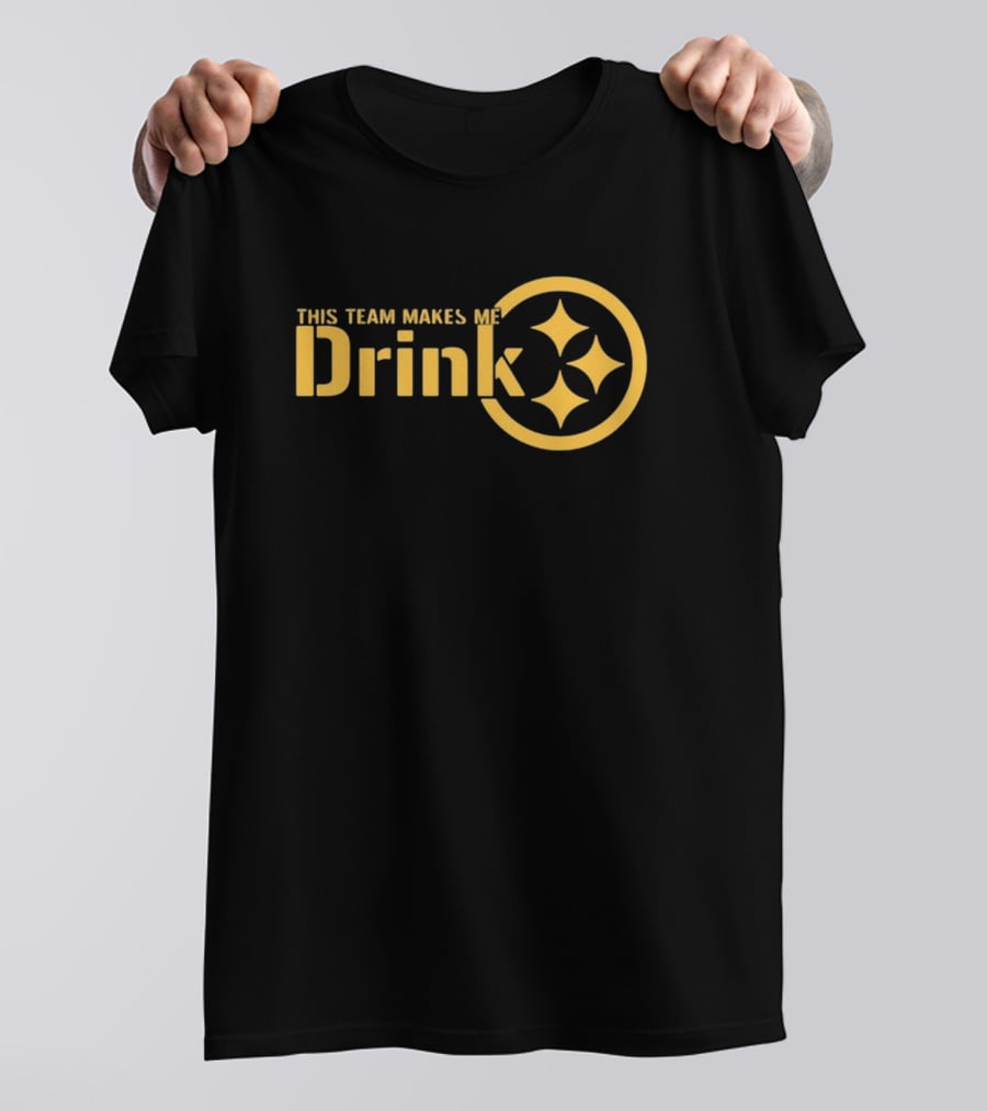This Team Makes Me Drink Pittsburgh Sports Fans Humor Yellow Shirt made from 100% pre-shrunk ring-spun cotton, unisex regular fit based on U.S. standard sizing. The shirt is designed, cut, sewn, and printed in the United States. Available in sizes S-5XL.