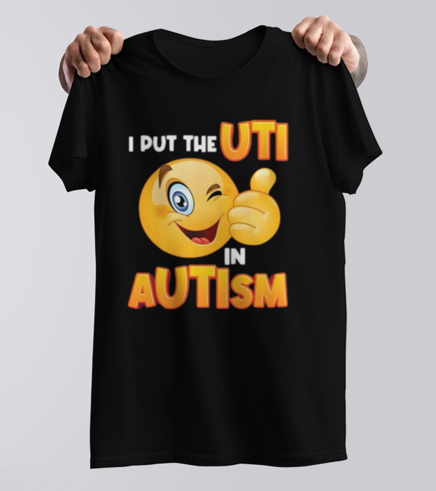 I Put The Uti In Autism Funny Winking Emoji Thumbs Up Shirt made from 100% pre-shrunk ring-spun cotton, unisex regular fit based on U.S. standard sizing. The shirt is designed, cut, sewn, and printed in the United States. Available in sizes S-5XL.