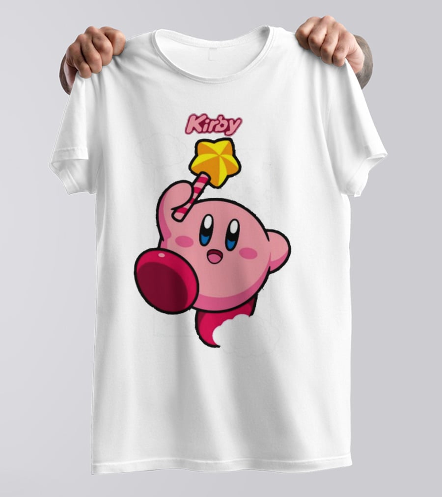 Kirby Main Character With Star Rod Gamestop Bioworld Shirt made from 100% pre-shrunk ring-spun cotton, unisex regular fit based on U.S. standard sizing. The shirt is designed, cut, sewn, and printed in the United States. Available in sizes S-5XL.