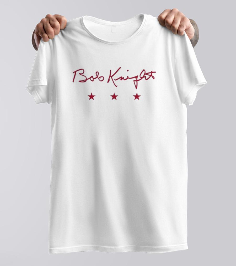 Bob Knight Red Signature Three Stars Indiana Basketball Shirt made from 100% pre-shrunk ring-spun cotton, unisex regular fit based on U.S. standard sizing. The shirt is designed, cut, sewn, and printed in the United States. Available in sizes S-5XL.