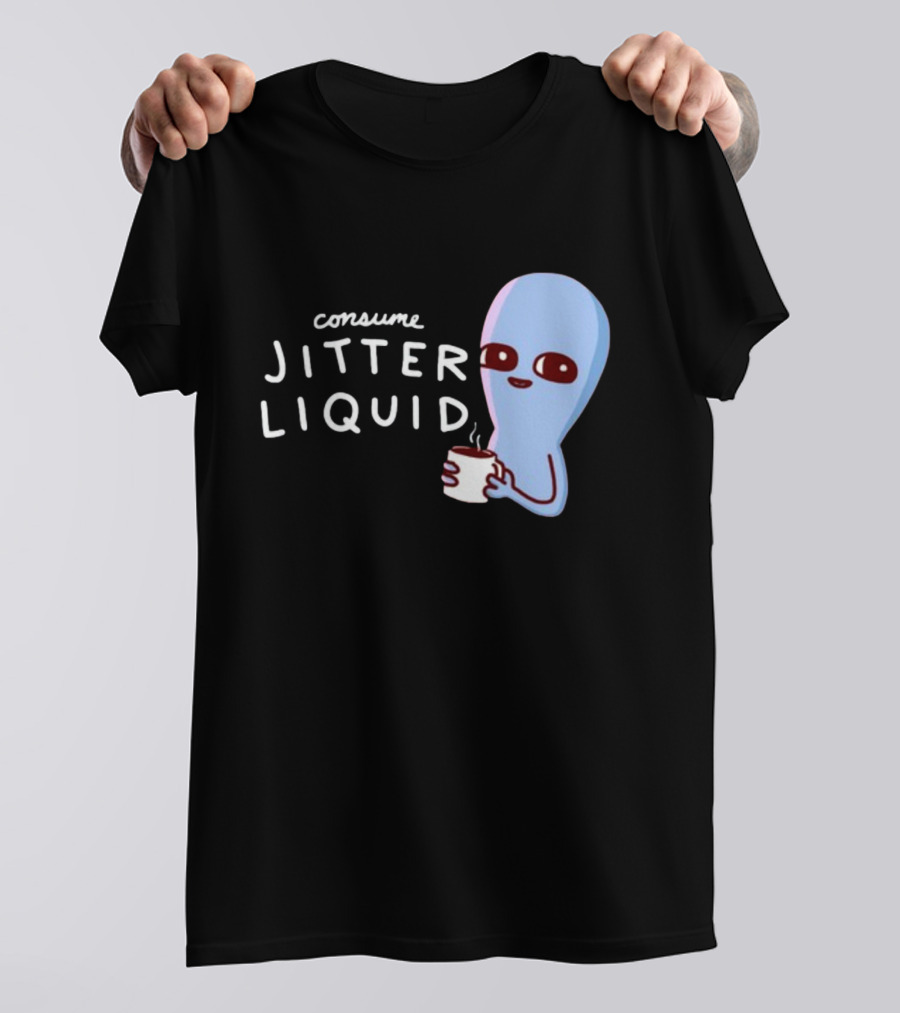 Consume Jitter Liquid Cute Alien with Coffee Mug Shirt made from 100% pre-shrunk ring-spun cotton, unisex regular fit based on U.S. standard sizing. The shirt is designed, cut, sewn, and printed in the United States. Available in sizes S-5XL.