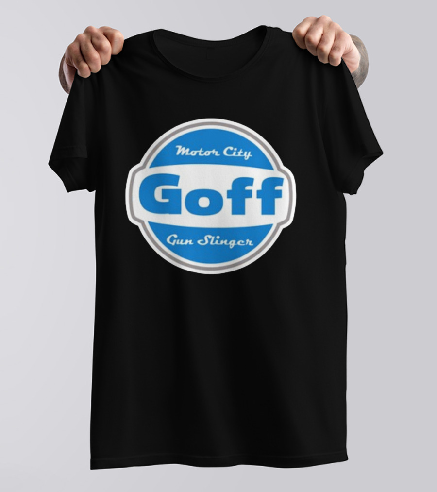 Goff Motor City Gun Slinger Shirt made from 100% pre-shrunk ring-spun cotton, unisex regular fit based on U.S. standard sizing. The shirt is designed, cut, sewn, and printed in the United States. Available in sizes S-5XL.