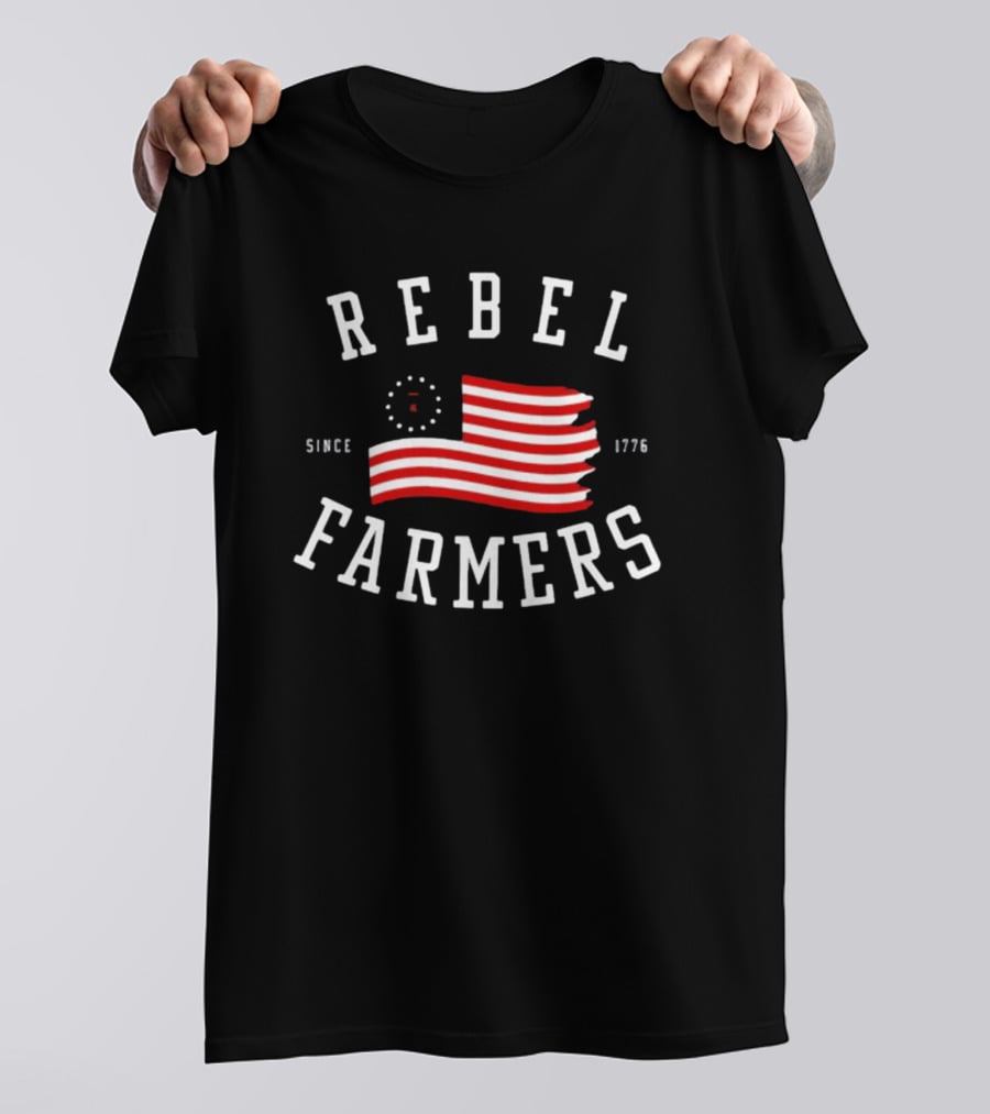 Gatlin Didier Rebel Farmers Since 1776 Flag Shirt made from 100% pre-shrunk ring-spun cotton, unisex regular fit based on U.S. standard sizing. The shirt is designed, cut, sewn, and printed in the United States. Available in sizes S-5XL.