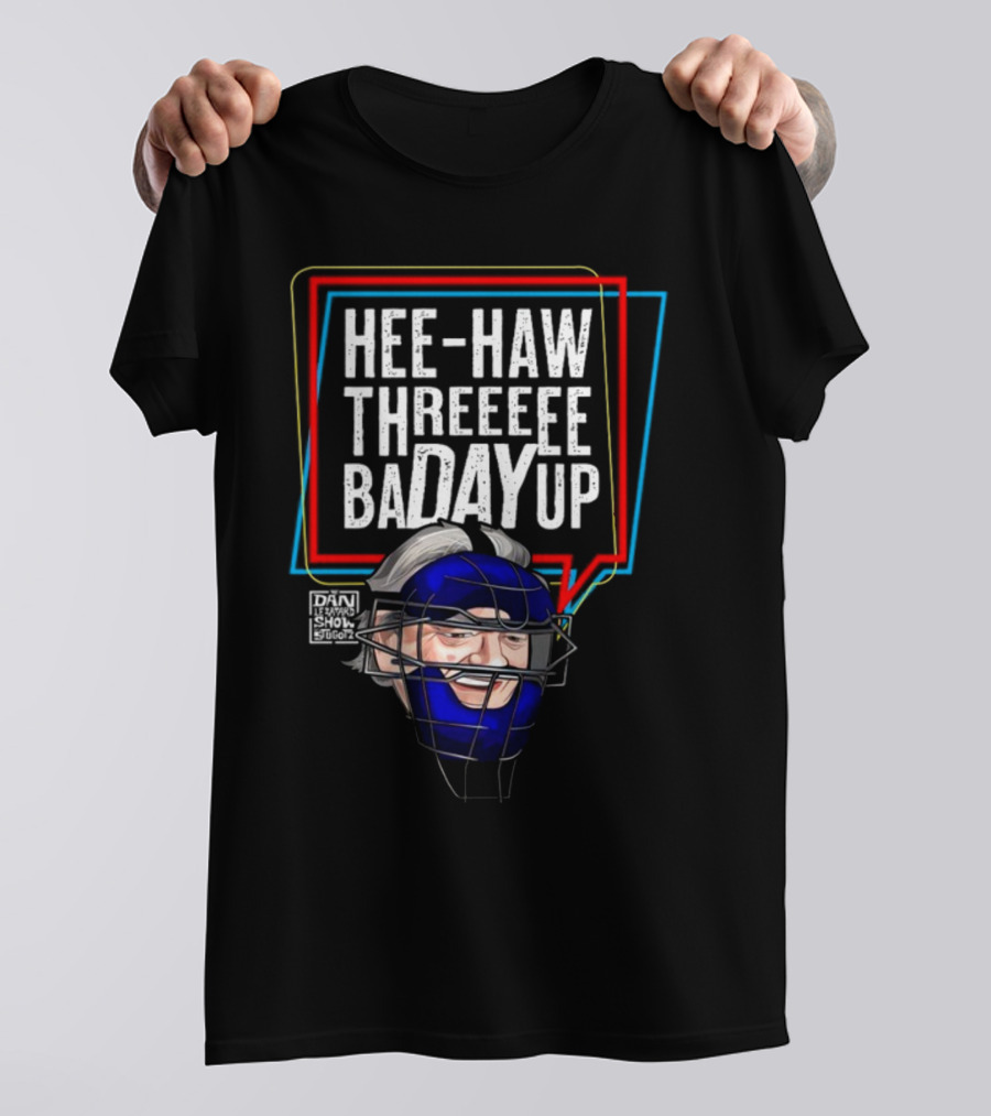 Hee-Haw Threeeee Badayup Dan Le Batard Show Catcher's Mask Shirt made from 100% pre-shrunk ring-spun cotton, unisex regular fit based on U.S. standard sizing. The shirt is designed, cut, sewn, and printed in the United States. Available in sizes S-5XL.