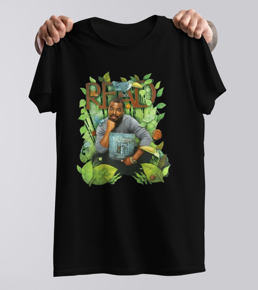 LeVar Burton Read The Tin Forest Surrounded by Lush Greenery and Animals Shirt made from 100% pre-shrunk ring-spun cotton, unisex regular fit based on U.S. standard sizing. The shirt is designed, cut, sewn, and printed in the United States. Available in sizes S-5XL.