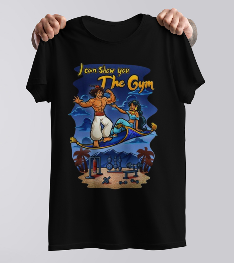 I Can Show You The Gym Flying Carpet Workout Dreams Shirt made from 100% pre-shrunk ring-spun cotton, unisex regular fit based on U.S. standard sizing. The shirt is designed, cut, sewn, and printed in the United States. Available in sizes S-5XL.