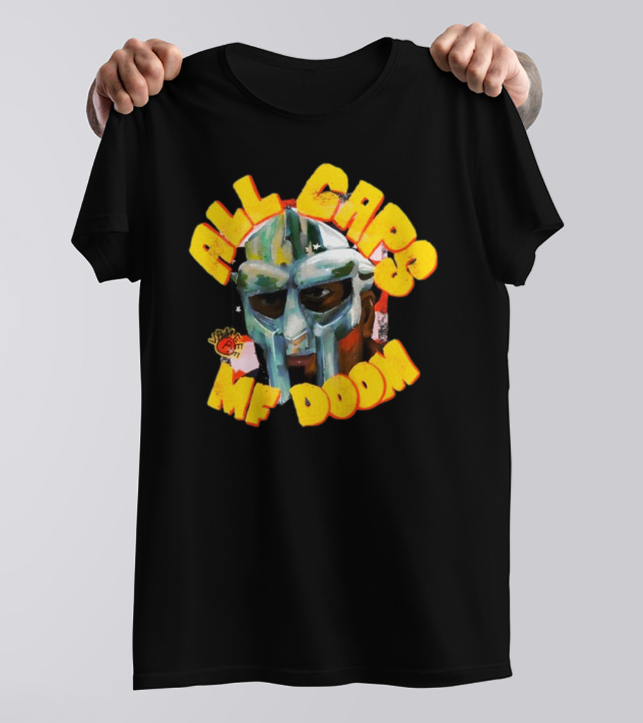All Caps MF DOOM Villain Graphic Mask Shirt made from 100% pre-shrunk ring-spun cotton, unisex regular fit based on U.S. standard sizing. The shirt is designed, cut, sewn, and printed in the United States. Available in sizes S-5XL.