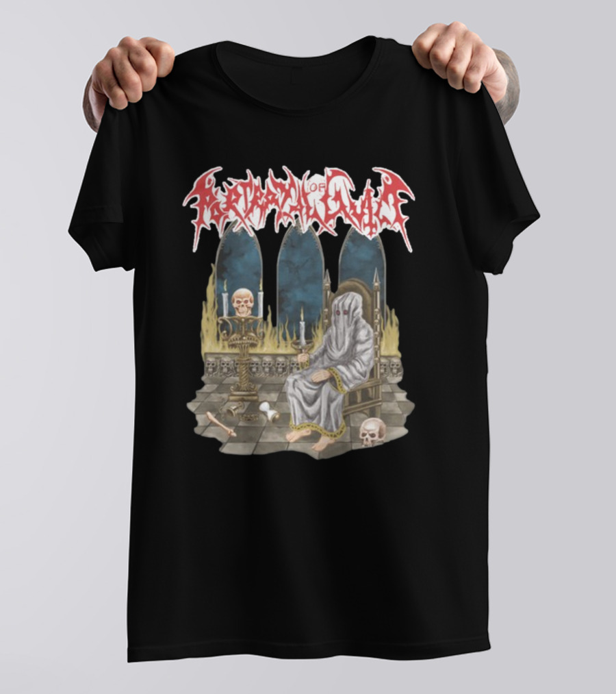 Portrayal Of Guilt Eyedust Cloaked Figure with Skull Throne and Candles Shirt made from 100% pre-shrunk ring-spun cotton, unisex regular fit based on U.S. standard sizing. The shirt is designed, cut, sewn, and printed in the United States. Available in sizes S-5XL.
