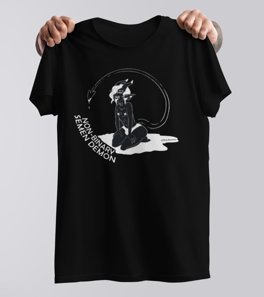 Non-Binary Semen Demon Fantasy Illustration by Party Skeletons Shirt made from 100% pre-shrunk ring-spun cotton, unisex regular fit based on U.S. standard sizing. The shirt is designed, cut, sewn, and printed in the United States. Available in sizes S-5XL.