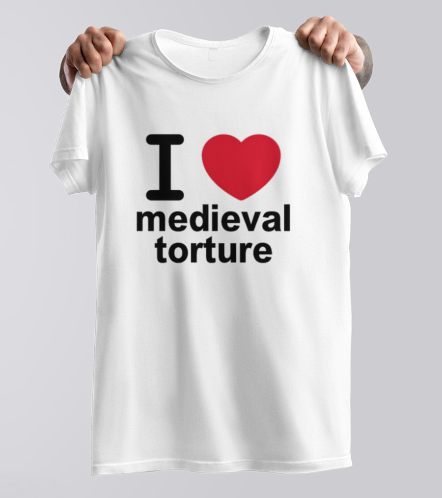 I Love Heart Medieval Torture Shirt made from 100% pre-shrunk ring-spun cotton, unisex regular fit based on U.S. standard sizing. The shirt is designed, cut, sewn, and printed in the United States. Available in sizes S-5XL.