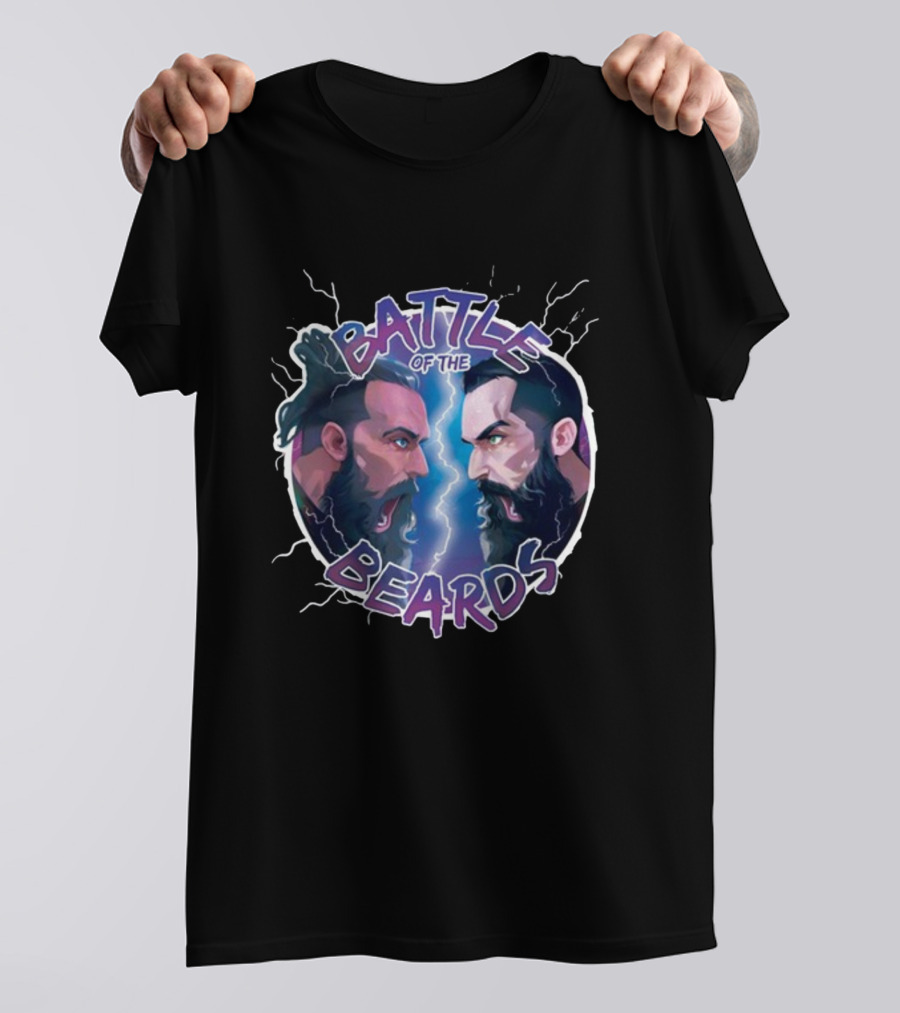 BATTLE OF THE BEARDS Showdown Clash Thunder Bolts Shirt made from 100% pre-shrunk ring-spun cotton, unisex regular fit based on U.S. standard sizing. The shirt is designed, cut, sewn, and printed in the United States. Available in sizes S-5XL.