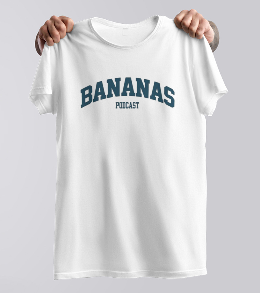BANANAS PODCAST Classic Logo Arch Shirt made from 100% pre-shrunk ring-spun cotton, unisex regular fit based on U.S. standard sizing. The shirt is designed, cut, sewn, and printed in the United States. Available in sizes S-5XL.