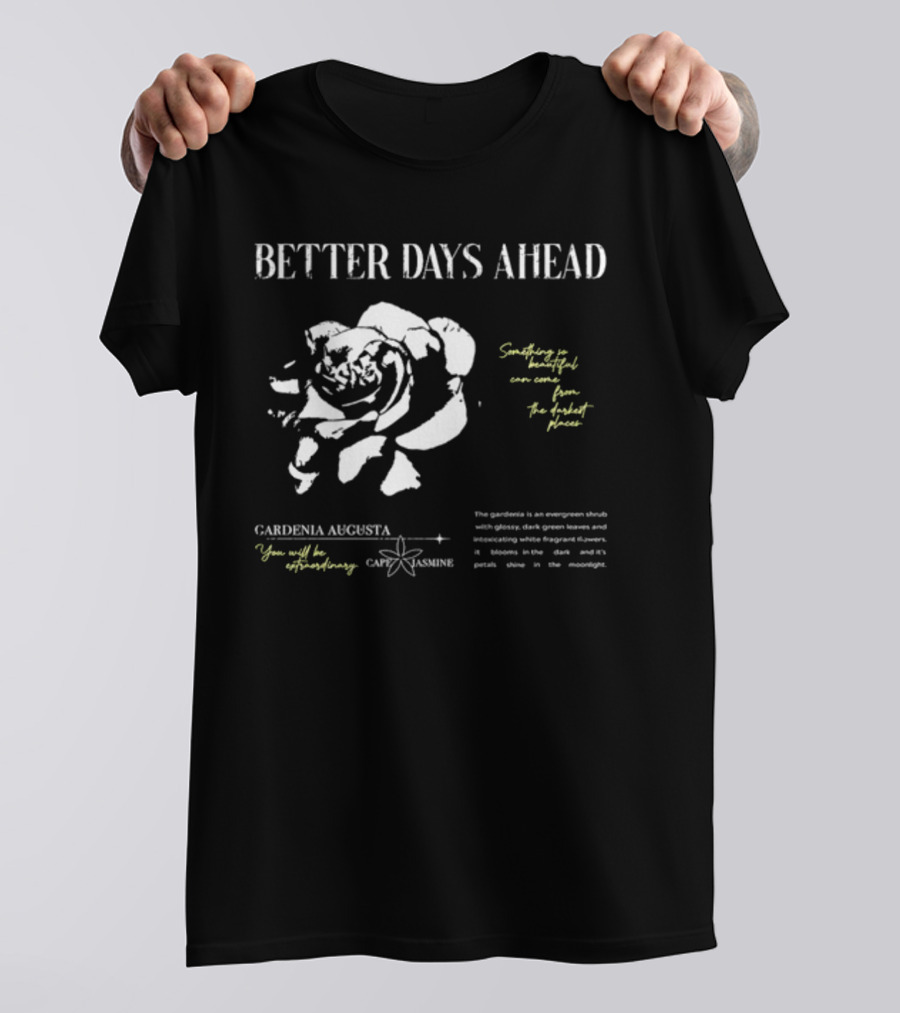 Better Days Ahead Gardenia Augusta Cape Jasmine Extraordinary Darkest Places Shirt made from 100% pre-shrunk ring-spun cotton, unisex regular fit based on U.S. standard sizing. The shirt is designed, cut, sewn, and printed in the United States. Available in sizes S-5XL.