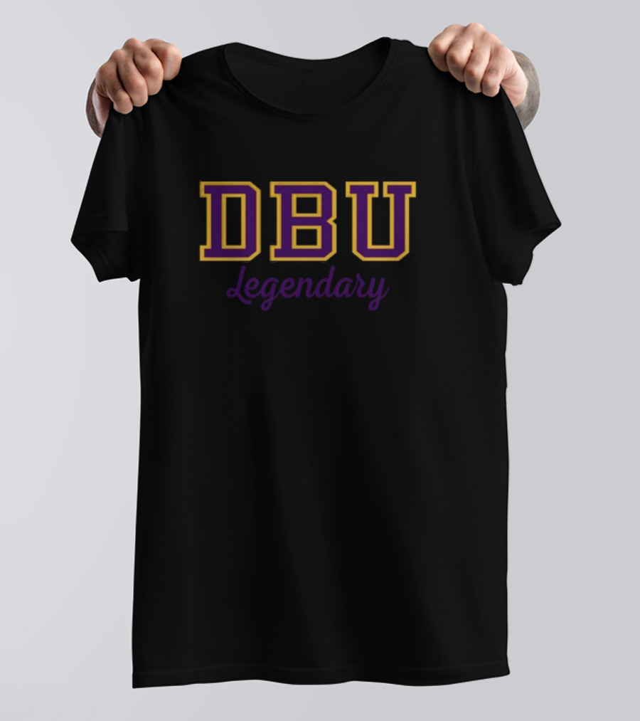 DBU Legendary Shirt made from 100% pre-shrunk ring-spun cotton, unisex regular fit based on U.S. standard sizing. The shirt is designed, cut, sewn, and printed in the United States. Available in sizes S-5XL.