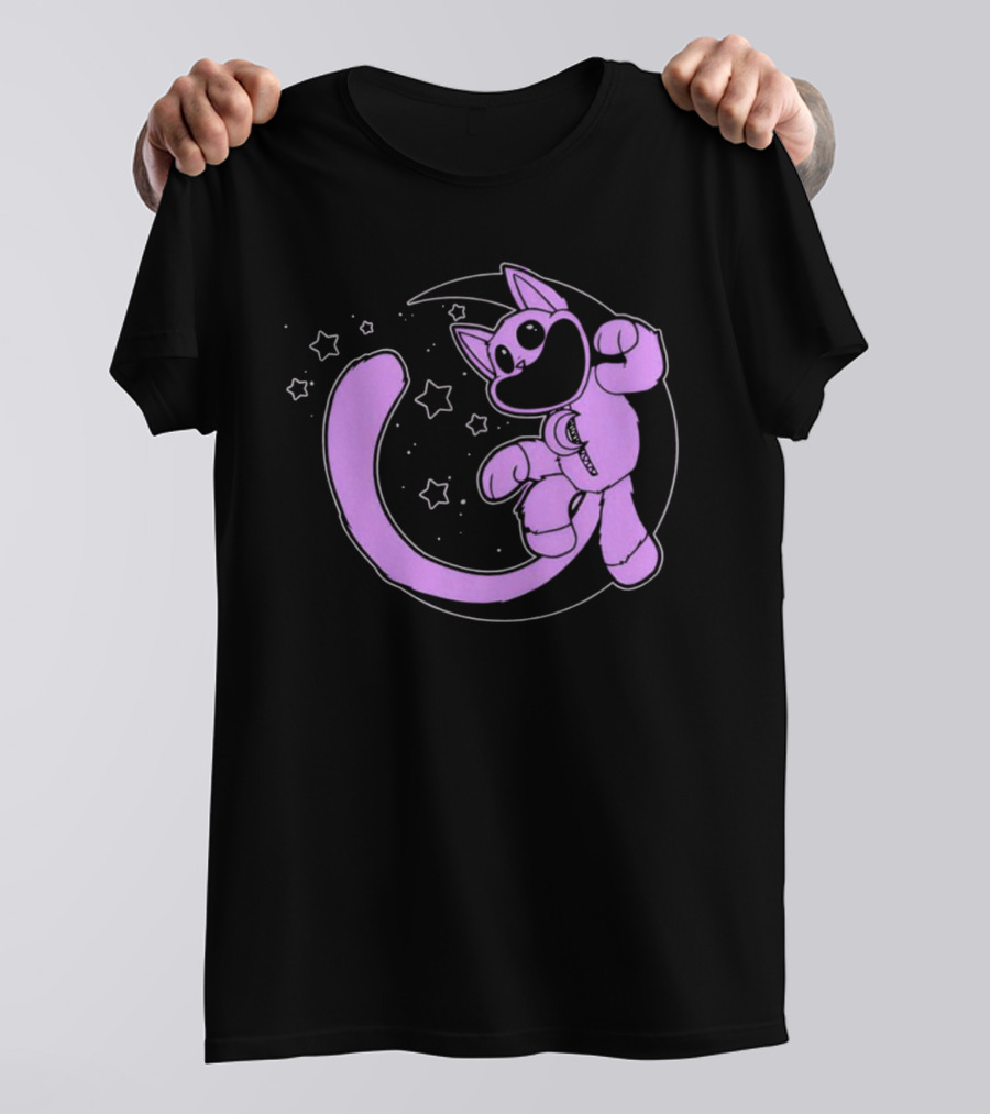 Purple Cartoon Cat with Stars and Moon Shirt made from 100% pre-shrunk ring-spun cotton, unisex regular fit based on U.S. standard sizing. The shirt is designed, cut, sewn, and printed in the United States. Available in sizes S-5XL.