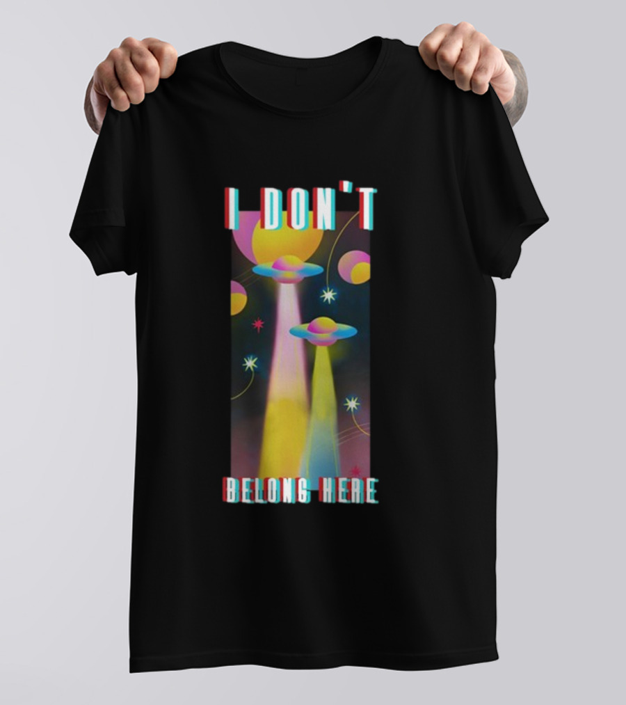 I Don't Belong Here UFO Spaceships Colorful Cosmic Scene T-Shirt
