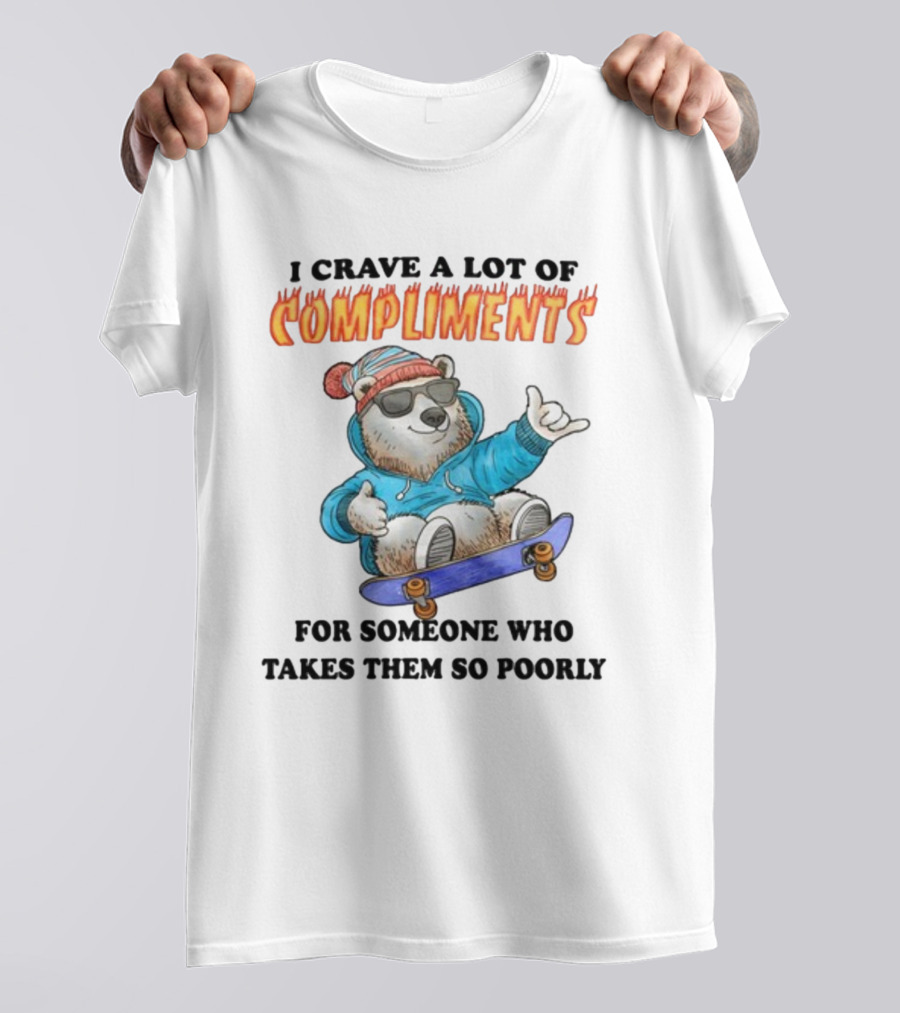 I Crave A Lot Of Compliments Bear On Skateboard With Sunglasses Shirt made from 100% pre-shrunk ring-spun cotton, unisex regular fit based on U.S. standard sizing. The shirt is designed, cut, sewn, and printed in the United States. Available in sizes S-5XL.