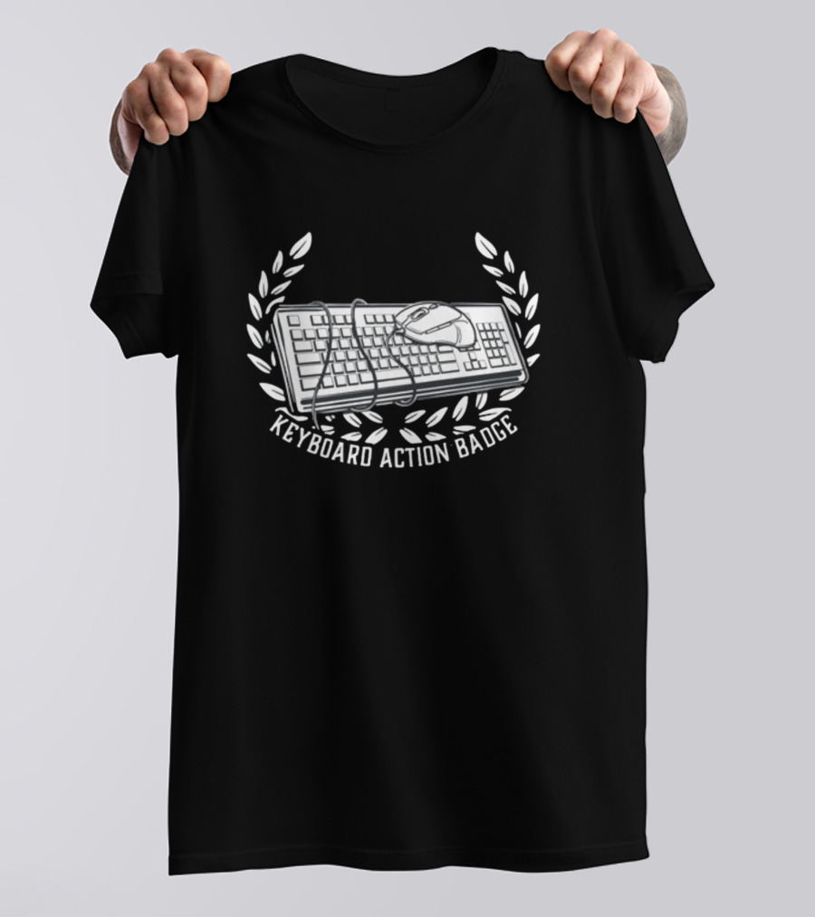 Keyboard Action Badge Laurel Wreath Emblem Shirt made from 100% pre-shrunk ring-spun cotton, unisex regular fit based on U.S. standard sizing. The shirt is designed, cut, sewn, and printed in the United States. Available in sizes S-5XL.