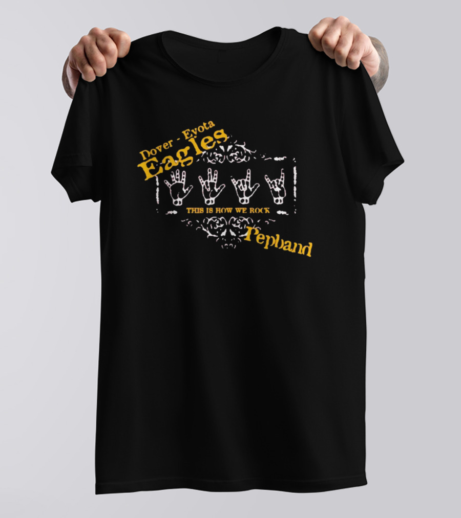 Dover Eyota Eagles Pep Band This Is How We Rock Shirt made from 100% pre-shrunk ring-spun cotton, unisex regular fit based on U.S. standard sizing. The shirt is designed, cut, sewn, and printed in the United States. Available in sizes S-5XL.