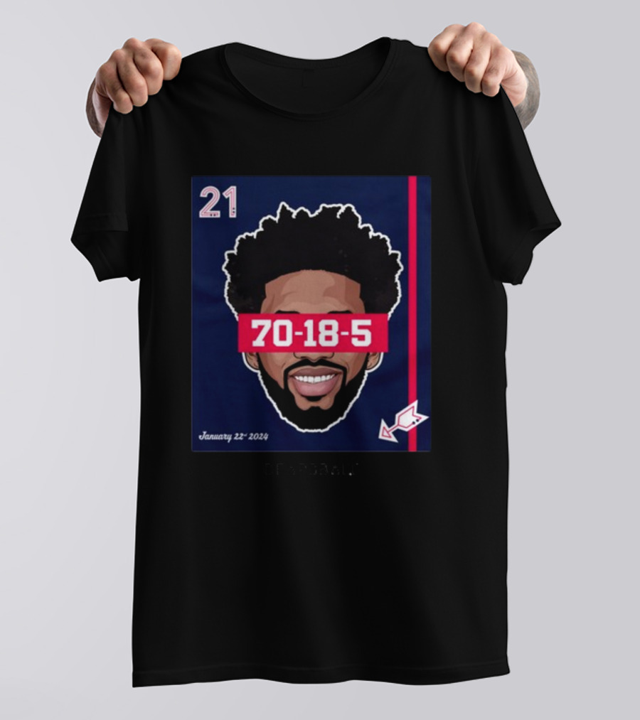 Joel Embiid 70-18-5 Dearbball January 22 Shirt made from 100% pre-shrunk ring-spun cotton, unisex regular fit based on U.S. standard sizing. The shirt is designed, cut, sewn, and printed in the United States. Available in sizes S-5XL.