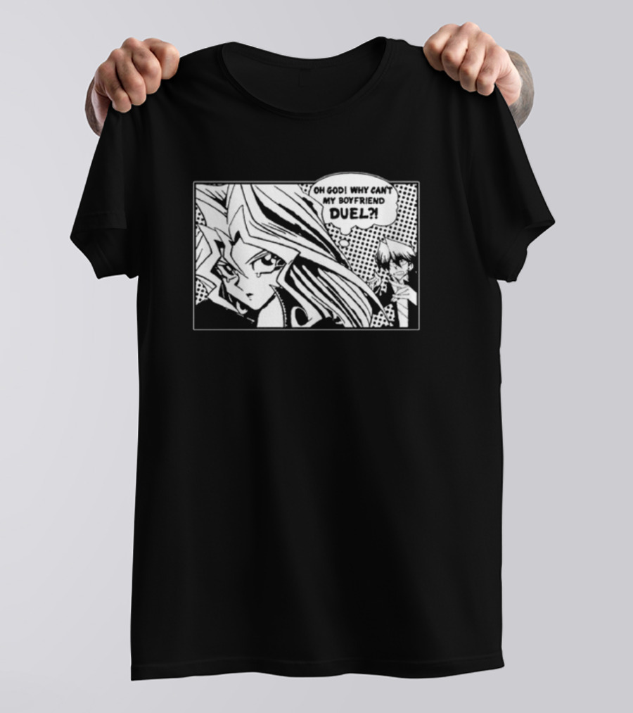 Mai Valentine Oh God Why Can't My Boyfriend Duel Manga Panel Shirt made from 100% pre-shrunk ring-spun cotton, unisex regular fit based on U.S. standard sizing. The shirt is designed, cut, sewn, and printed in the United States. Available in sizes S-5XL.