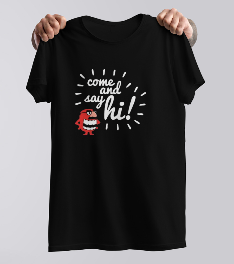Ministryoftesting Come And Say Hi Red Cartoon Character Shirt made from 100% pre-shrunk ring-spun cotton, unisex regular fit based on U.S. standard sizing. The shirt is designed, cut, sewn, and printed in the United States. Available in sizes S-5XL.