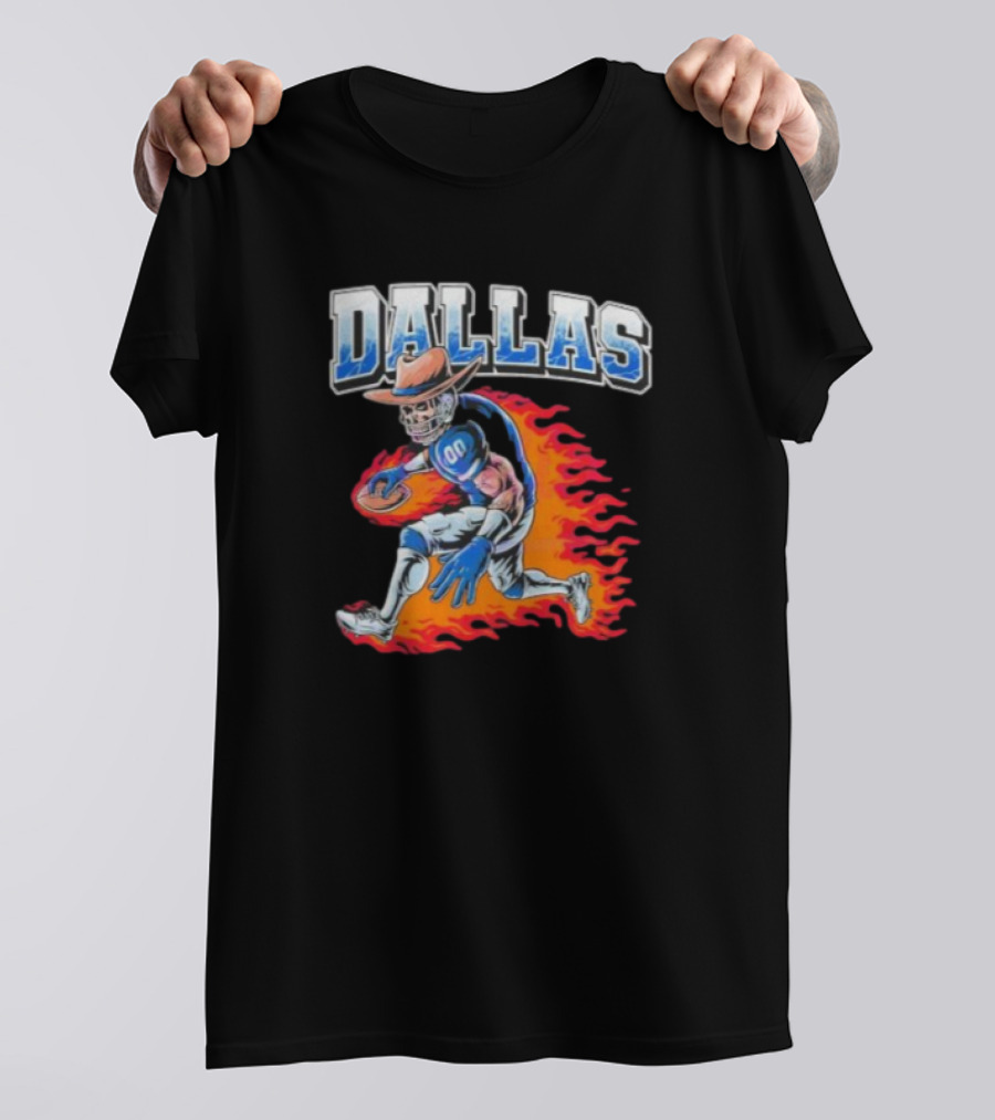 Dallas Cowboy Football Skeleton Player in Flames Shirt made from 100% pre-shrunk ring-spun cotton, unisex regular fit based on U.S. standard sizing. The shirt is designed, cut, sewn, and printed in the United States. Available in sizes S-5XL.