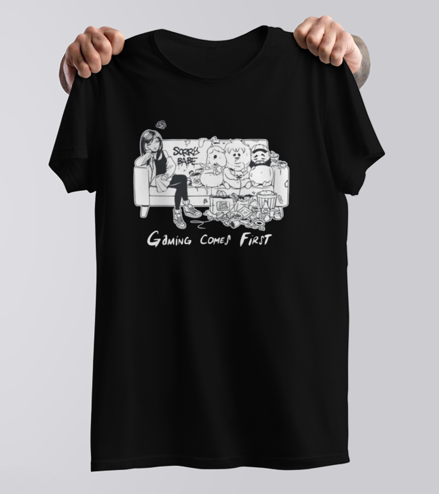 Sorry Babe Gaming Comes First Couch Scene with Characters and Fabs Rich Text Shirt made from 100% pre-shrunk ring-spun cotton, unisex regular fit based on U.S. standard sizing. The shirt is designed, cut, sewn, and printed in the United States. Available in sizes S-5XL.