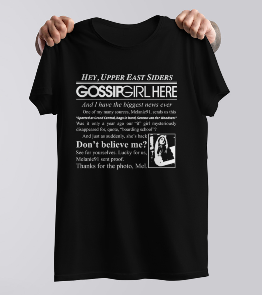 Hey Upper East Siders Gossip Girl Here Biggest News Ever Serena van der Woodsen Spotted at Grand Central Shirt made from 100% pre-shrunk ring-spun cotton, unisex regular fit based on U.S. standard sizing. The shirt is designed, cut, sewn, and printed in the United States. Available in sizes S-5XL.