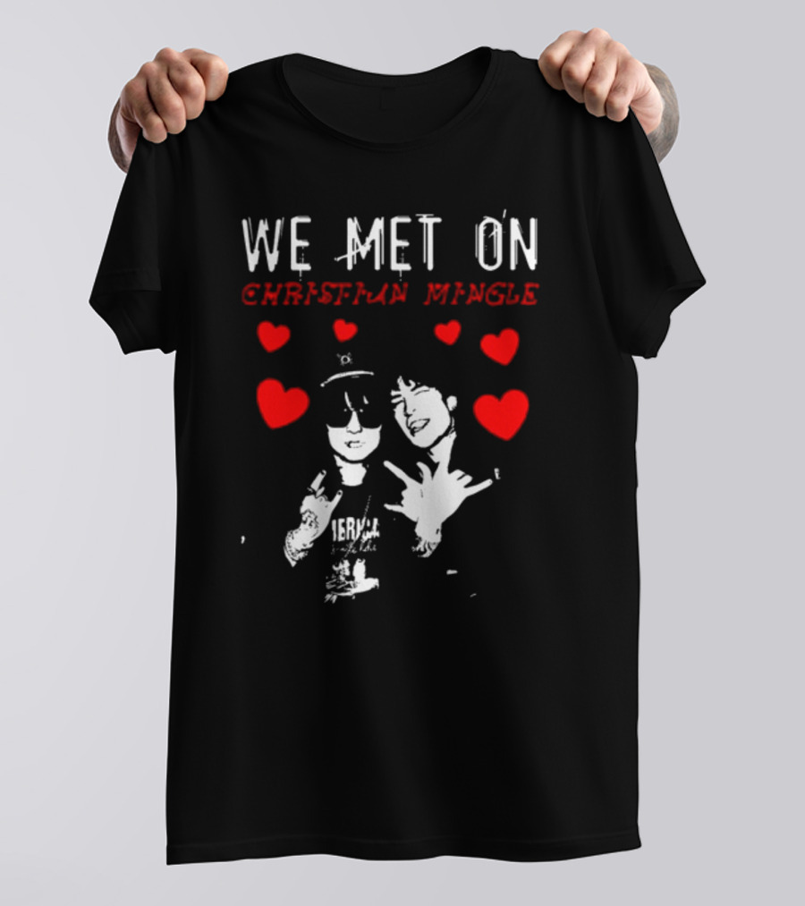 We Met On Christian Mingle Jake Webber Johnnie Guilbert Hearts Alkalinedrip Shirt made from 100% pre-shrunk ring-spun cotton, unisex regular fit based on U.S. standard sizing. The shirt is designed, cut, sewn, and printed in the United States. Available in sizes S-5XL.