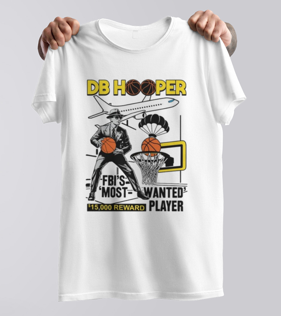 DB Hooper FBI's Most Wanted Player $15,000 Reward Basketball Airplane Shirt made from 100% pre-shrunk ring-spun cotton, unisex regular fit based on U.S. standard sizing. The shirt is designed, cut, sewn, and printed in the United States. Available in sizes S-5XL.