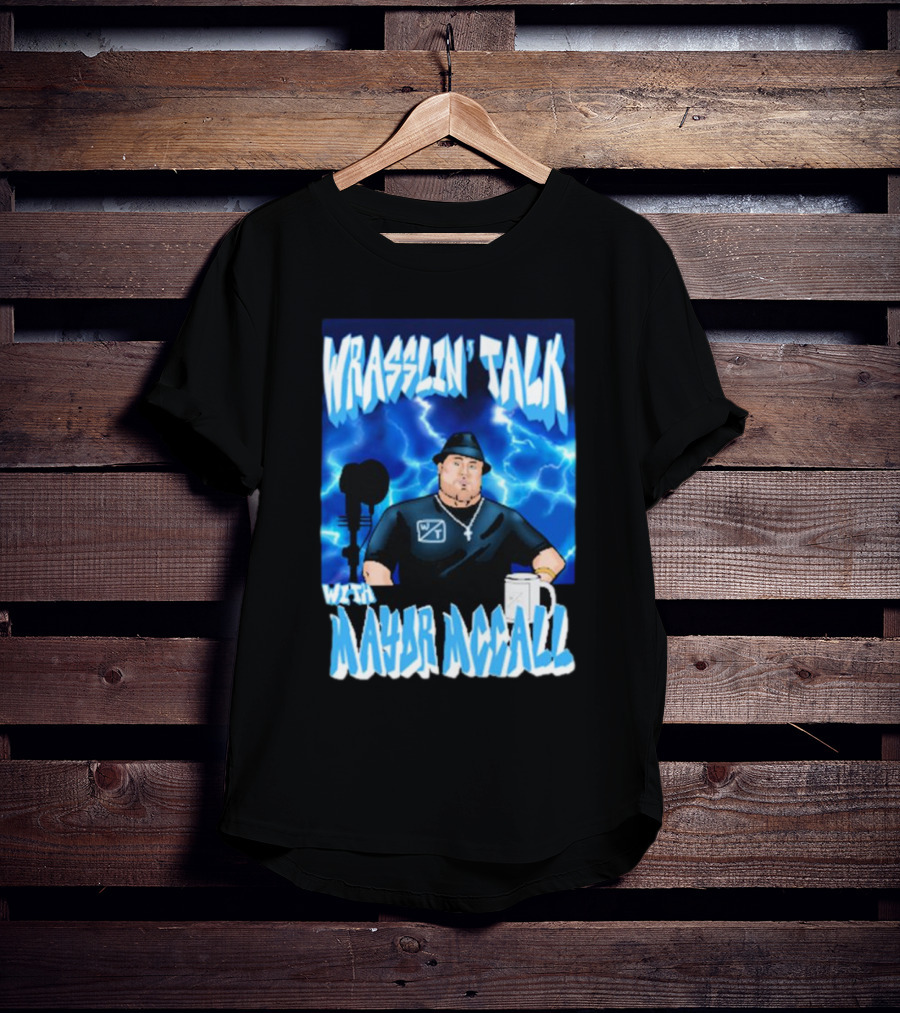 Wrasslin' Talk With Mayor Mccall Blue Lightning Shirt made from 100% pre-shrunk ring-spun cotton, unisex regular fit based on U.S. standard sizing. The shirt is designed, cut, sewn, and printed in the United States. Available in sizes S-5XL.
