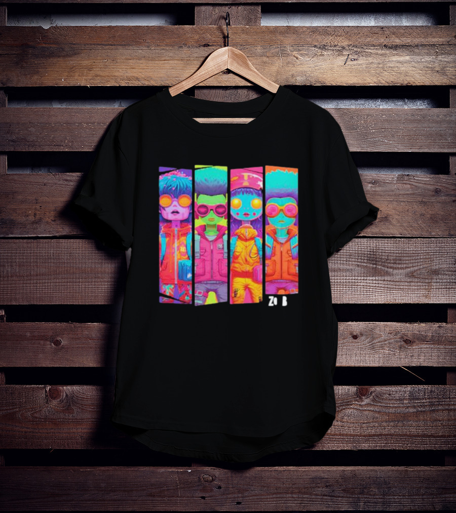 Zombie Quad Neon Colorful Character Stripes ZO B Shirt made from 100% pre-shrunk ring-spun cotton, unisex regular fit based on U.S. standard sizing. The shirt is designed, cut, sewn, and printed in the United States. Available in sizes S-5XL.