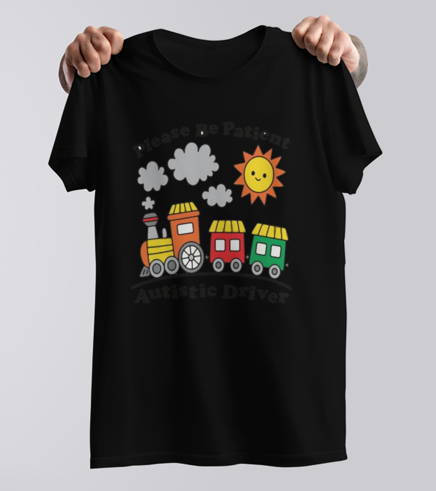 Please Be Patient Autistic Driver Train with Sun and Clouds Shirt made from 100% pre-shrunk ring-spun cotton, unisex regular fit based on U.S. standard sizing. The shirt is designed, cut, sewn, and printed in the United States. Available in sizes S-5XL.