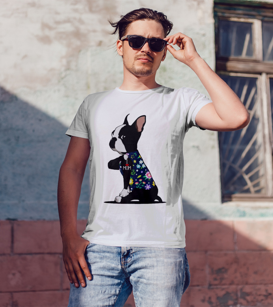 Boston Terrier I Love Mom Flower Tattoos T-Shirt