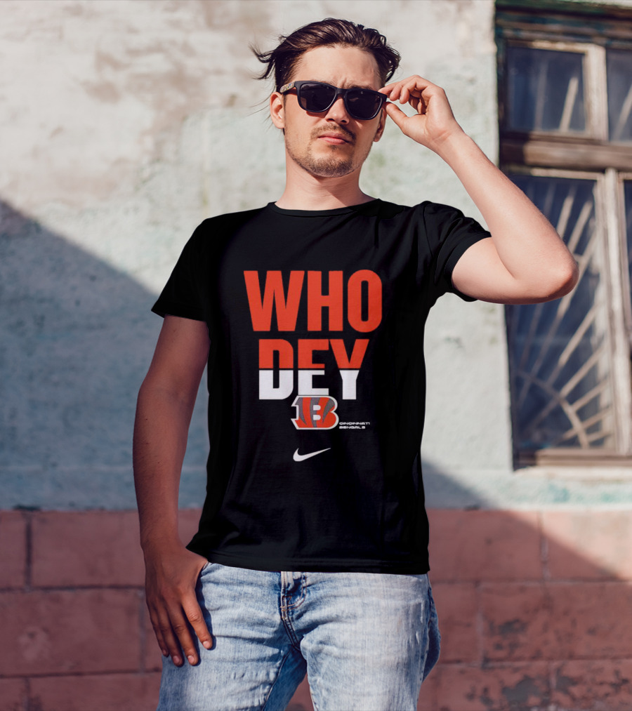 Cincinnati Bengals Who Dey Shirt made from 100% pre-shrunk ring-spun cotton, unisex regular fit based on U.S. standard sizing. The shirt is designed, cut, sewn, and printed in the United States. Available in sizes S-5XL.
