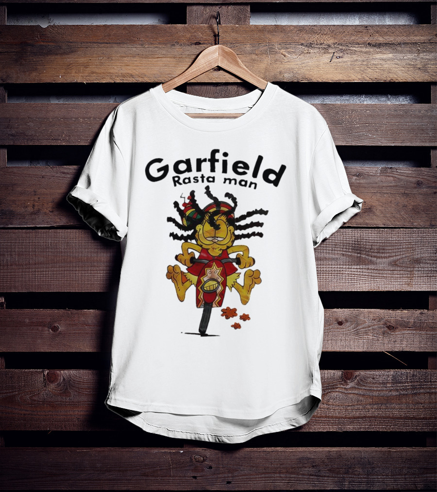 Garfield Rasta Man Dreadlocks Bicycle Whimsical Fun Shirt made from 100% pre-shrunk ring-spun cotton, unisex regular fit based on U.S. standard sizing. The shirt is designed, cut, sewn, and printed in the United States. Available in sizes S-5XL.