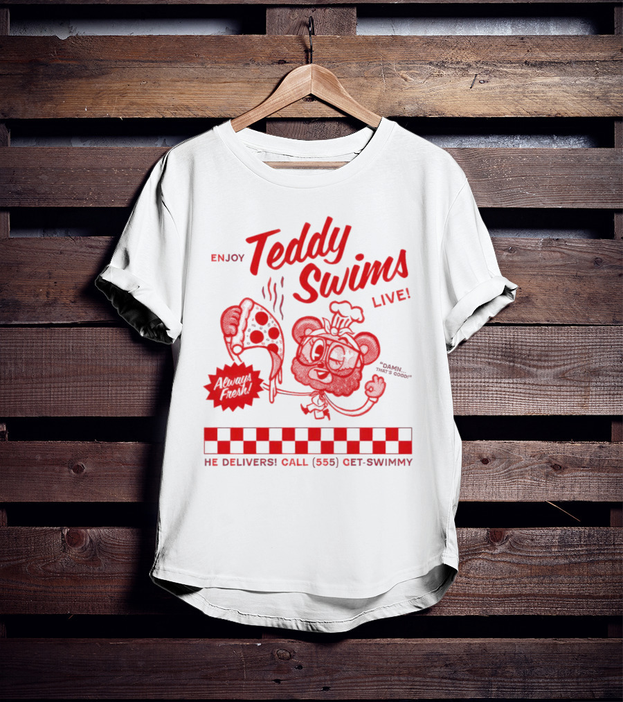 Enjoy Teddy Swims Live Always Fresh Pizza He Delivers Call 555 Get-Swimmy Shirt made from 100% pre-shrunk ring-spun cotton, unisex regular fit based on U.S. standard sizing. The shirt is designed, cut, sewn, and printed in the United States. Available in sizes S-5XL.