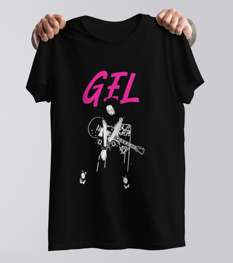 GELHARDCORE GEL NANA Guitar Girl Graphic Pink Lettering Shirt made from 100% pre-shrunk ring-spun cotton, unisex regular fit based on U.S. standard sizing. The shirt is designed, cut, sewn, and printed in the United States. Available in sizes S-5XL.