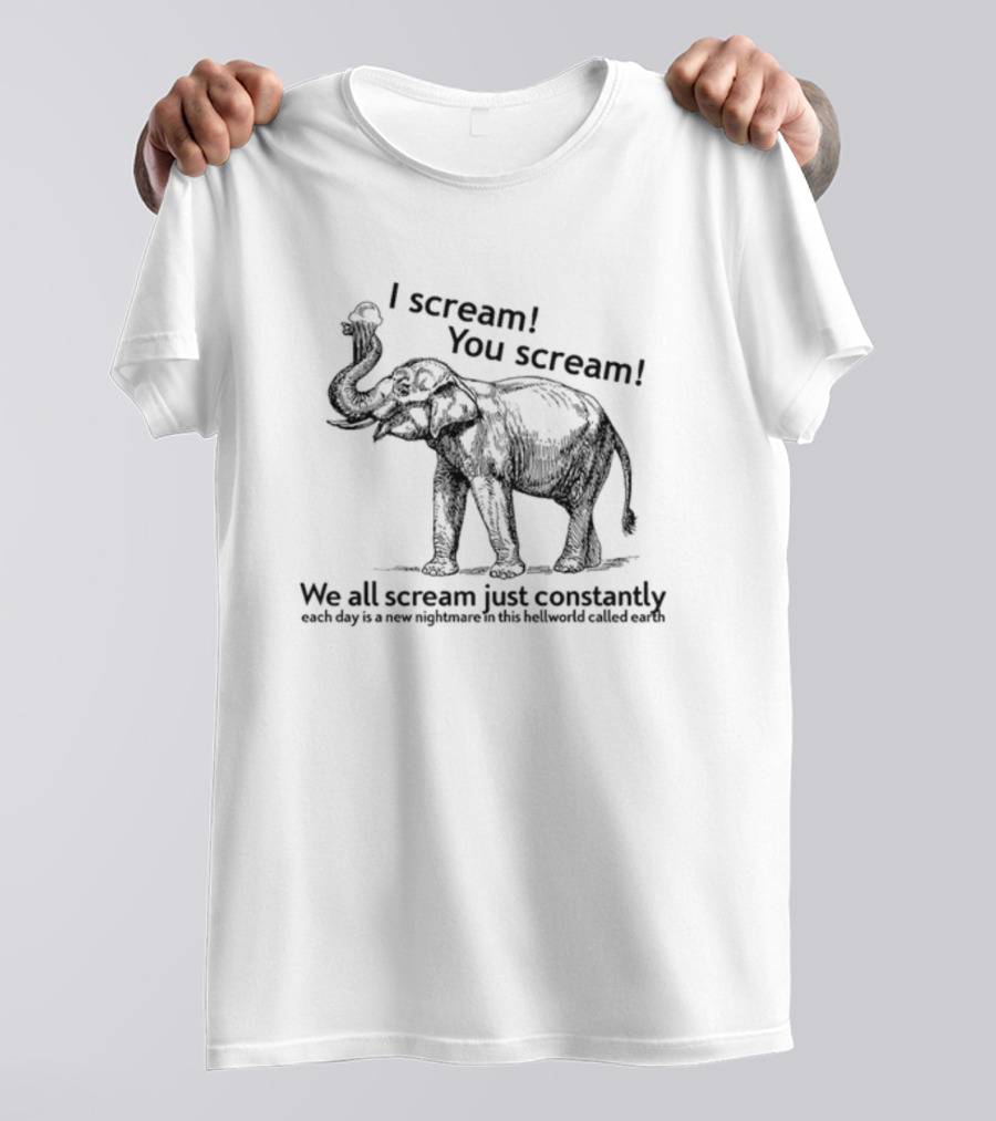 I Scream You Scream We All Scream Just Constantly Each Day Is A New Nightmare In This Hellworld Called Earth Elephant Shirt made from 100% pre-shrunk ring-spun cotton, unisex regular fit based on U.S. standard sizing. The shirt is designed, cut, sewn, and printed in the United States. Available in sizes S-5XL.