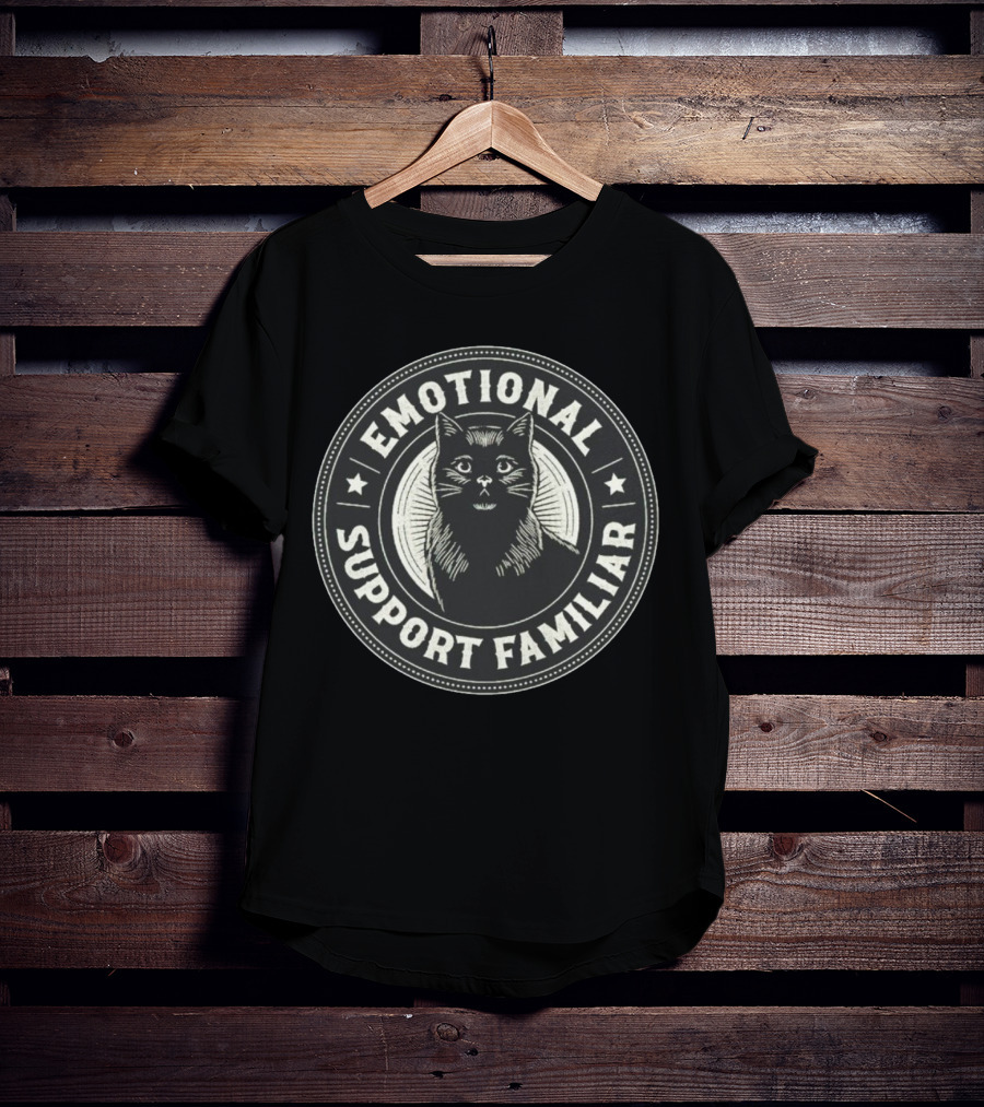 Emotional Support Familiar Black Cat Shirt made from 100% pre-shrunk ring-spun cotton, unisex regular fit based on U.S. standard sizing. The shirt is designed, cut, sewn, and printed in the United States. Available in sizes S-5XL.