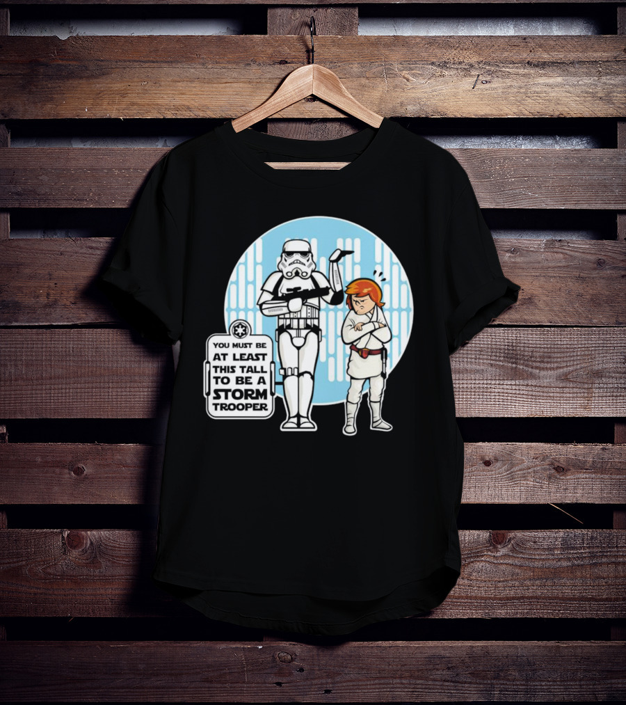 Star Wars You Must Be At Least This Tall To Be A Storm Trooper Sign With Luke Skywalker Shirt made from 100% pre-shrunk ring-spun cotton, unisex regular fit based on U.S. standard sizing. The shirt is designed, cut, sewn, and printed in the United States. Available in sizes S-5XL.