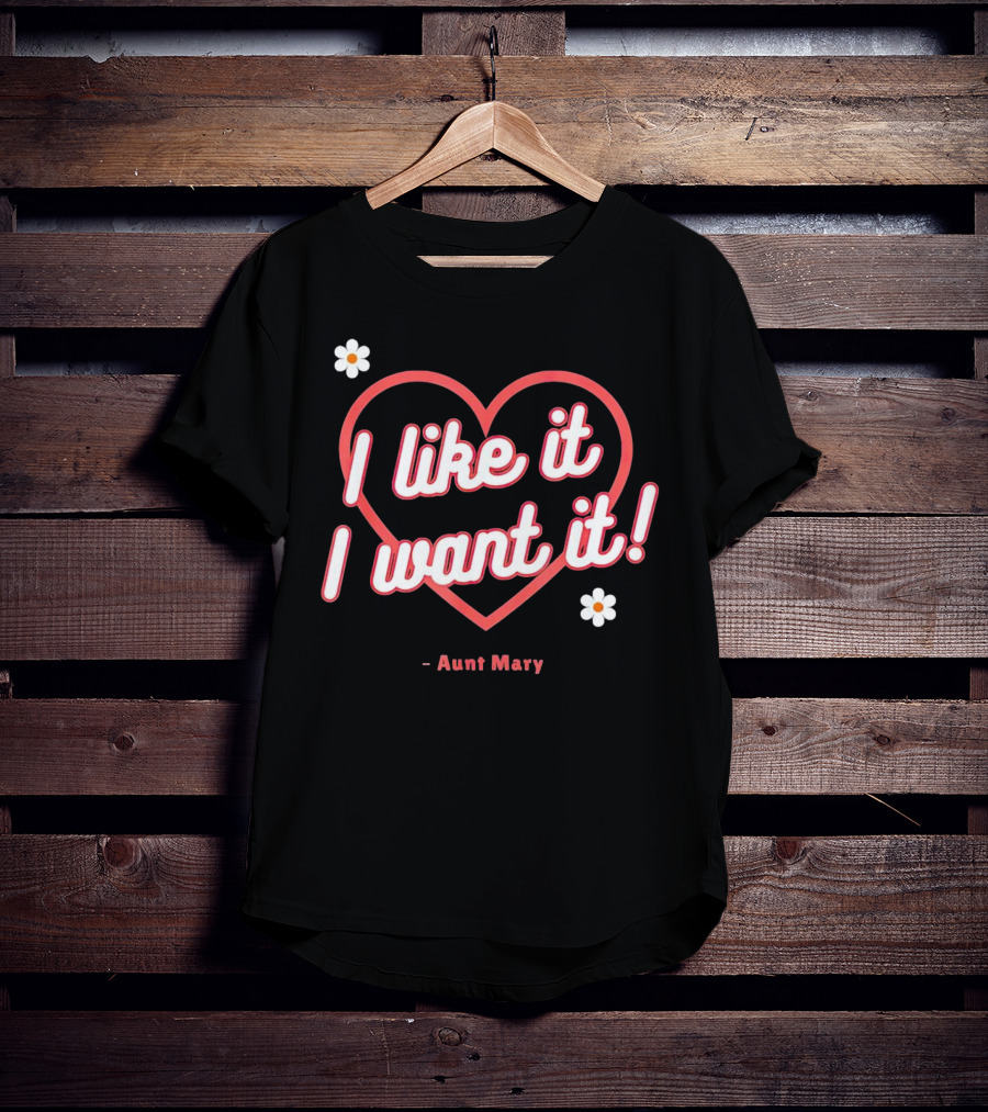 I Like It I Want It Heart and Flowers Aunt Mary Shirt made from 100% pre-shrunk ring-spun cotton, unisex regular fit based on U.S. standard sizing. The shirt is designed, cut, sewn, and printed in the United States. Available in sizes S-5XL.